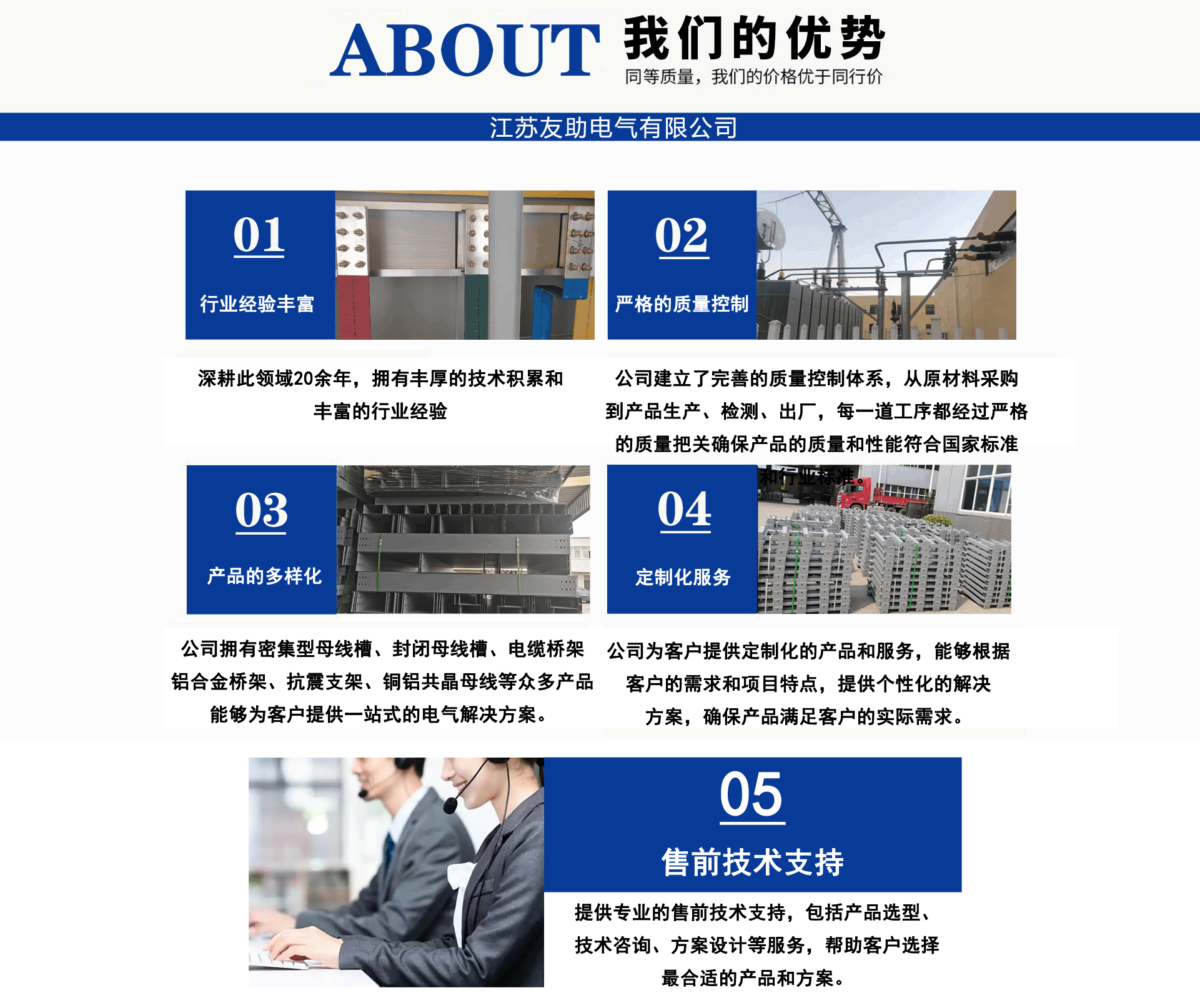江蘇友助電氣有限公司地處中國工程電氣生產基地-一江蘇省揚中市。經營范圍:電纜橋架,母線槽(橋),管型母線,銅軟連接(伸縮節),高低壓開關柜,配電箱,抗震支架產品系列。 公司宗旨:客戶至上。已成功為江蘇二十屆省運會會場-泰州體育館,南京寶龍商業綜合體,張家口百兆瓦風電場,濟源市婦幼醫院,威海市未來科技園,湖北皇恩燁新材料科技有限公司,南京中央路小學,南通中天大酒店,新疆新安特鋼有限公司,河北省送變電有限公司,南京南微醫學研發基地等多項工程配套服務,我們愿與您精誠合作,互利共贏!公司技術人員深耕橋架,母線領域30年,為您提供橋架,母線槽疑難問題解決方案。母線槽不論每相是單排,雙排,三根排重疊,不管有多少個水平彎、垂直彎,轉接排在發貨前預裝一遍,確保尺寸無誤。到現場直接擰螺絲,效率高,橫平豎直,規規矩矩,符合標準,供電局,業主,監理,驗收易通過。供貨周期3-7天。為了讓尊貴客戶您,設備安全通電,高枕無憂。我們提供如下售前售中售后服務: 售前:免費技術支持,咨詢。 售中:免費現場精確測繪、設計。 售后:安裝服務,免費指導?!≠|量是生命,客戶是源泉。承諾客戶的,一定全力做到。讓我們一起進步!...